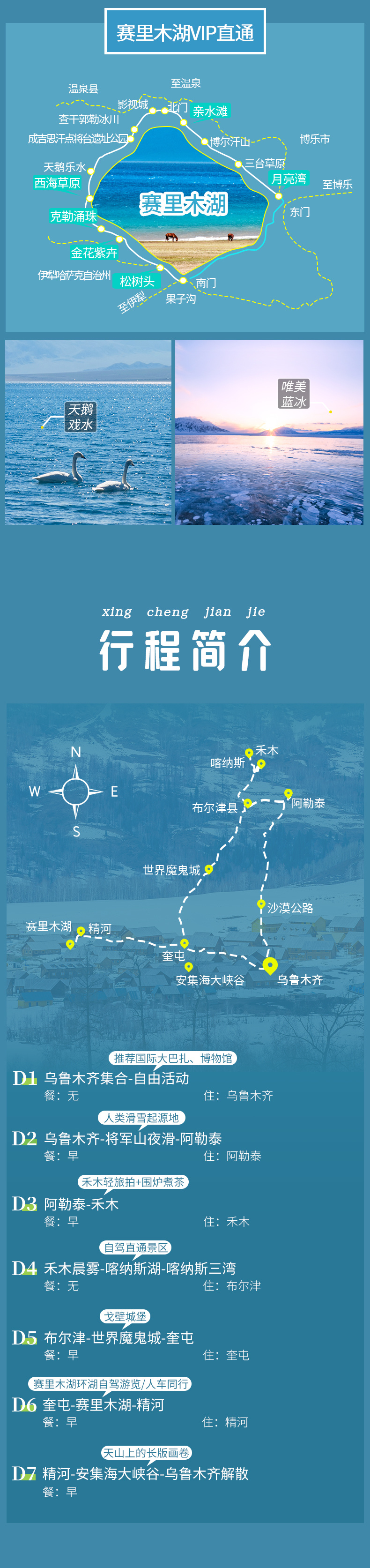 1.2米以下为儿童,含车位费、滑雪、赠送项目、保险、免门票、酒店免早餐,不含酒店住宿,超高但未满12周岁需补门票410元+早餐费240元(禾木不含早餐),如需占床补床位费1800含早餐。 | ||||
