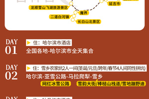 品质套餐:哈尔滨4钻酒店标间1晚,雪乡农家炕2人一间(圣诞元旦跨年春节团期同性4人间拼炕),牡丹江4钻酒店标间1晚,延吉4钻酒店标间1晚,二道镇4钻温泉酒店标间1晚,吉林5钻酒店标间1晚;