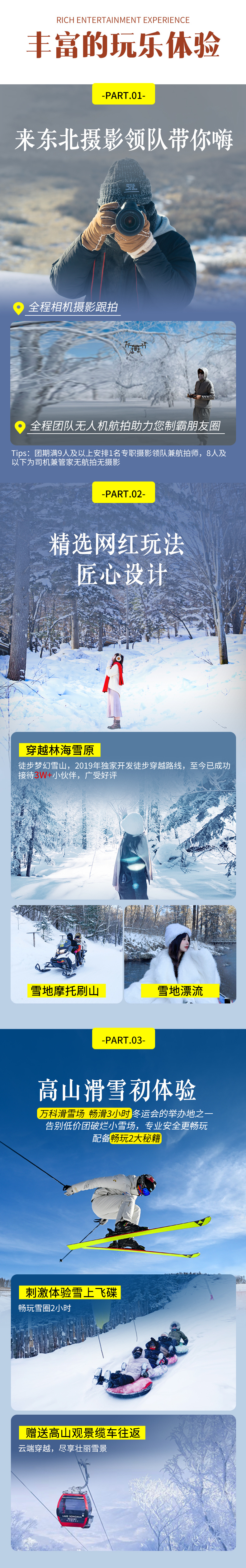 4、门票:雪乡门票+往返环保车、梦幻雪山徒步穿越门票、图们中朝友谊桥门票、朝鲜民俗园门票、长白山北景区全含(门票+往返环保车+摆渡车+天池倒站车)、雪地漂流门票、万科滑雪套票包含(雪鞋雪板雪杖头盔使用+滑雪3小时+雪圈2小时+高山缆车观光1次,滑雪时间从取雪具开始计算,到还雪具结束)