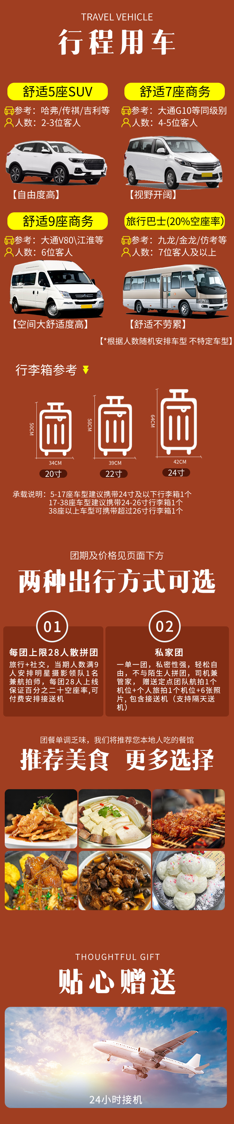 7、赠送24小时接机服务,1人也可接,前后航班相差半小时会等待其他小伙伴,请您谅解,提前2日预定,否则视为自动放弃;接机车辆非行程用车并且无空座率。