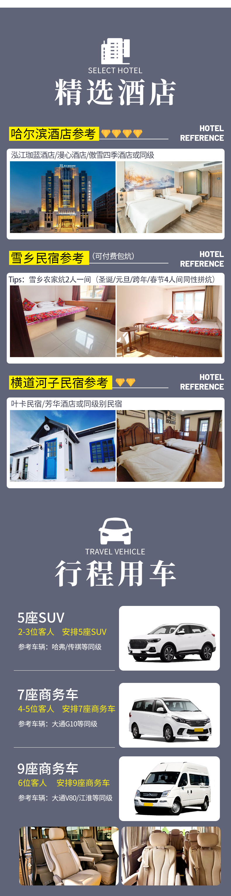 1.2米以下为儿童,含车位费、雪乡炕位、滑雪、赠送项目、保险、免门票、免早餐,不含酒店住宿;超高但未满12周岁需补门票72元+早餐费60元;如需占床需补床位费2晚酒店 700元/人,1晚农家炕如想单住请现询客服 私家团费用说明: · 2人起天天发团,司机兼管家,如逢单数报名产生空床位需补单房差 · 雪乡2人一间炕(包括圣诞/跨年/元旦/春节团期) · 包含解散日或隔天统一送机 · 2-3客人用5座SUV,4-5客人用7座商务车,6客人用9座商务车,7-8客人用大九座商务车,9-12客人用15-18座旅行巴士,保证百分之二十空座率。(如用15座及以上车型每日行程时间会比小型商务车增加1-3小时不等,望您悉知。) 优惠团期补900元/人(包含雪乡炕位升级),如产生空床位需要补单房差1600元(400+300+900) 平价团期补1100元/人(包含雪乡炕位升级),如产生空床位需要补单房差2200元(500+600+1100) 正价团期补1300元/人(包含雪乡炕位升级),如产生空床位需要补单房差2600元(600+700+1300) 元旦/圣诞/跨年团期如需升级酒店请现询客服。 春节团期如需升级酒店请现询客服。 升级参考酒店如下: 哈尔滨市:参考施柏阁酒店或皇冠假日或新巴黎酒店或同级5钻酒店 雪乡:参考雪筑遇见/纳山纳雪/雪韵假日/万嘉森林或同级别4钻轻奢民宿 横道河子民宿:与散拼团同标准,补差价不含这一晚费用 | ||||