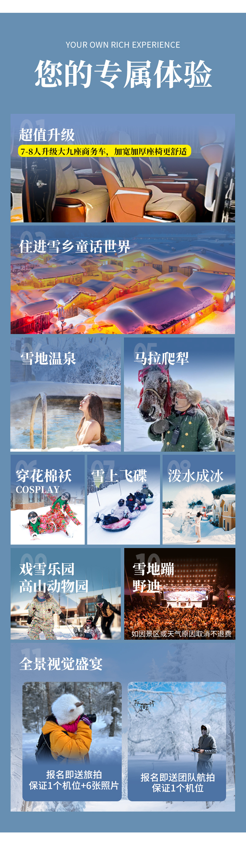 1.2米以下为儿童,含车位费、雪乡炕位、滑雪、赠送项目、保险、免门票、免早餐,不含酒店住宿、不含雪地漂流,不含温泉正常1.2米以下免票如遇收费自理;超高但未满12周岁需补门票370元+温泉100元/次+早餐费120元;如需占床需补床位费3晚酒店800元/人含早餐含温泉,1晚农家炕如想单住请现询客服 私家团费用说明: · 2人起天天发团,司机兼管家,如逢单数报名产生空床位需补单房差 · 雪乡2人一间炕(包括圣诞/跨年/元旦/春节团期) · 包含解散日或隔天统一送机 · 2-3人客人用5座SUV,4-5客人用7座商务车,6客人用9座商务车,7-8客人用大九座商务车,9-12客人用15-18座旅行巴士,保证百分之二十空座率。(如用15座及以上车型每日行程时间会比小型商务车增加1-3小时不等,望您悉知。) 优惠团期补1000元/人(包含雪乡炕位升级),如产生空床位需要补单房差1700元(400+300+1000) 升级参考酒店如下: 哈尔滨市:参考施柏阁酒店或皇冠假日或新巴黎酒店或同级5钻酒店 雪乡:参考雪筑遇见/纳山纳雪/雪韵假日/万嘉森林或同级别4钻轻奢民宿 敦化市:与散拼团同为4钻酒店标准,补差价不含这一晚费用 | ||||
