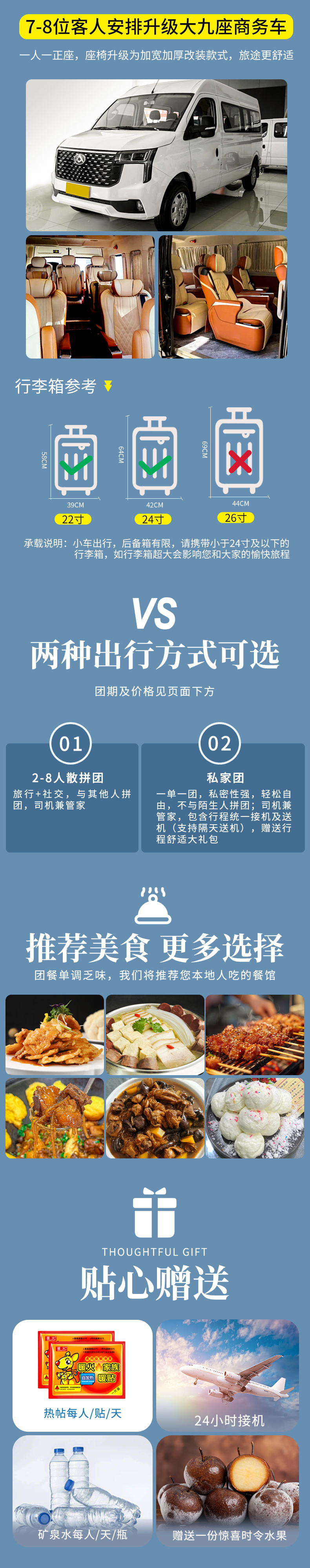 3、用车:2-3客人用5座SUV,4-5客人用7座商务车,6客人用9座商务车,7-8客人用大九座商务车,保证旅途舒适舒心。(小团副驾驶及前后座位置需要轮流乘坐,望悉知)