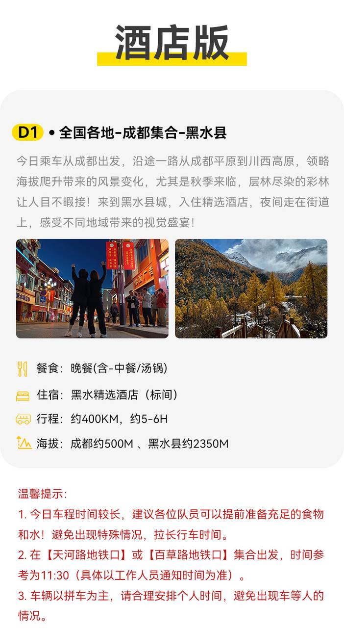 1.成都出发黑水县,集合时间大概11:00左右,具体以工作人员通知为准,错过大巴车出发时间,需自费拼车前往。