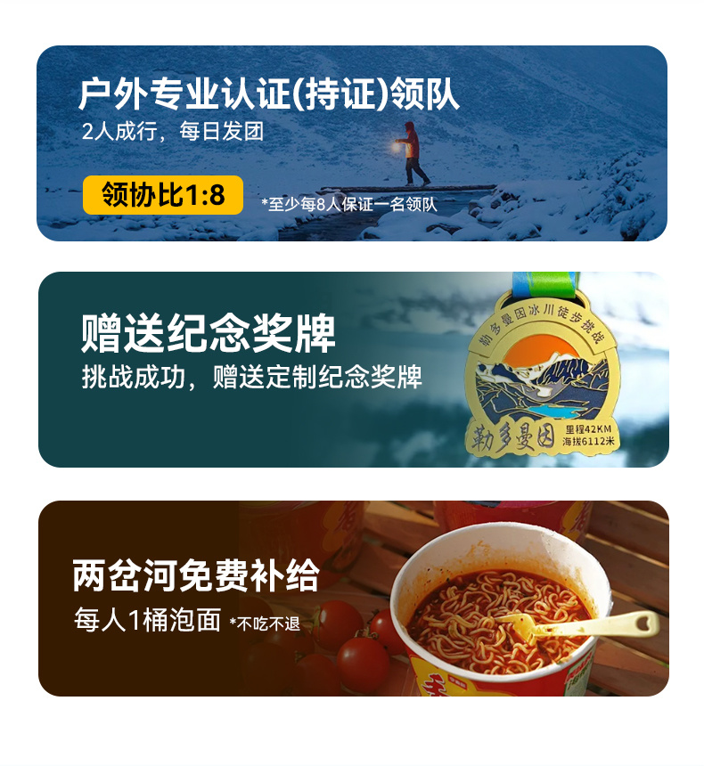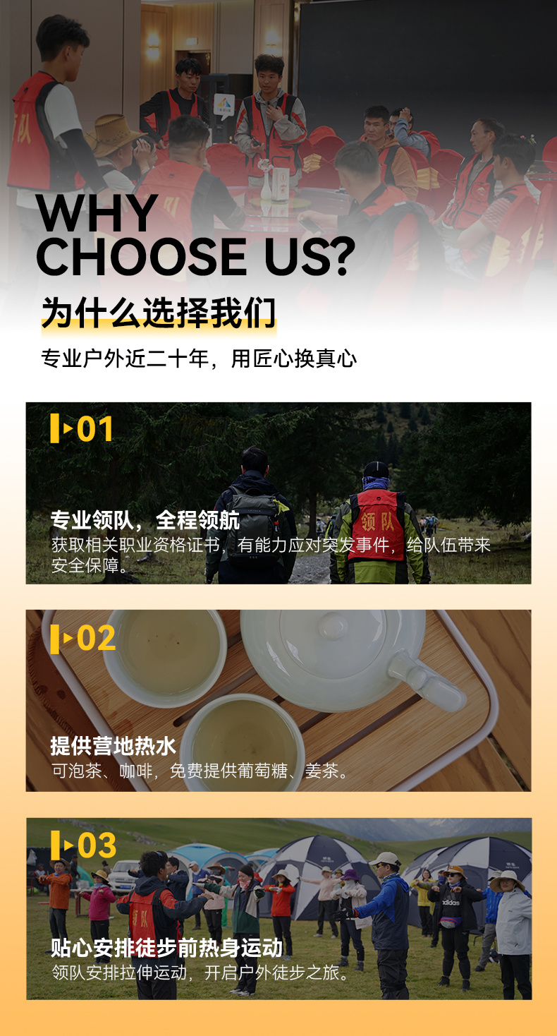 4.领队:户外专业认证(持证)领队,领协比1:8。