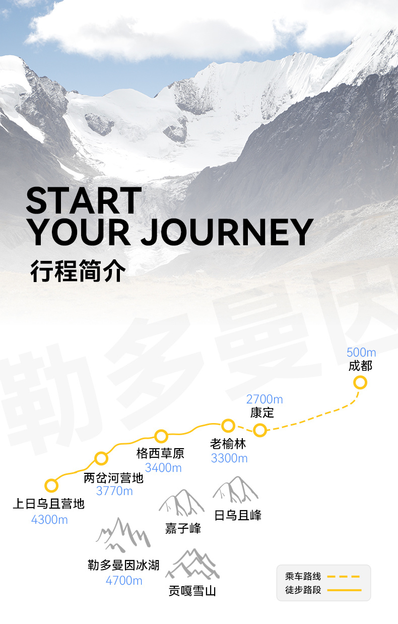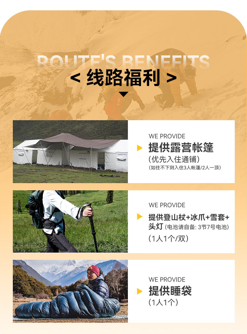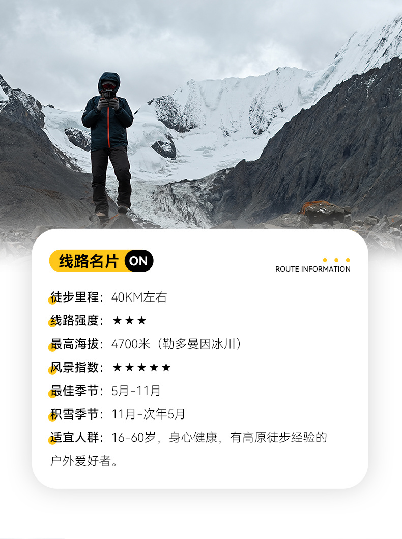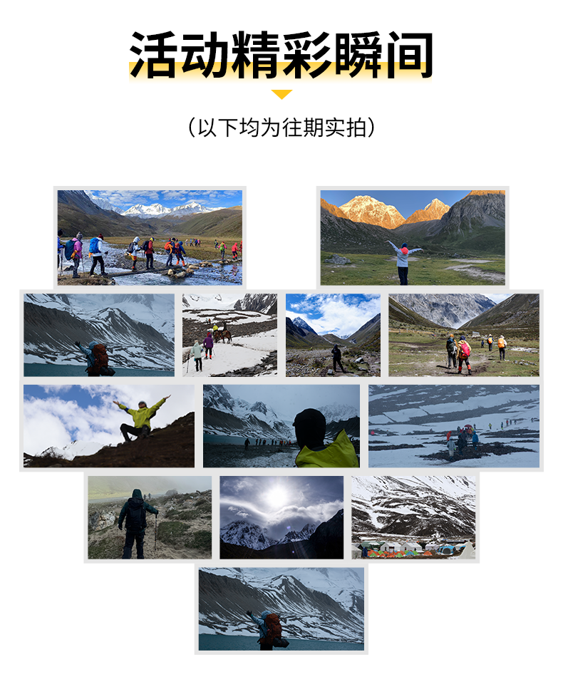 15.本次活动全线为高海拔地区,经过海拔最高为4600M的勒多曼因冰川,平均海拔在4000M左右,请正确评估自己的身体情况做正确评估,以决定参加与否。