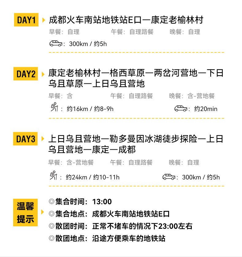 D3 上日乌且营地 (往返徒步约8KM) - 勒多曼因冰湖徒步探险 - 上日乌且营地 (徒步约16KM) - 康定 - 成都