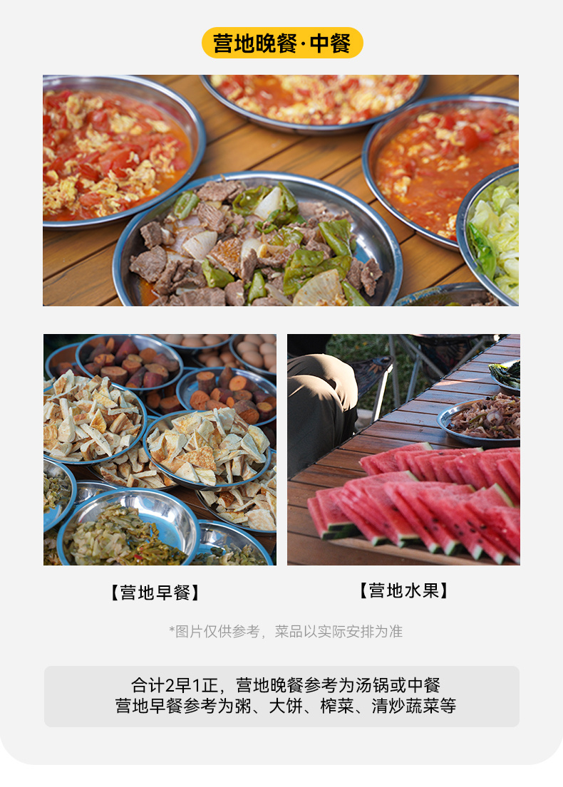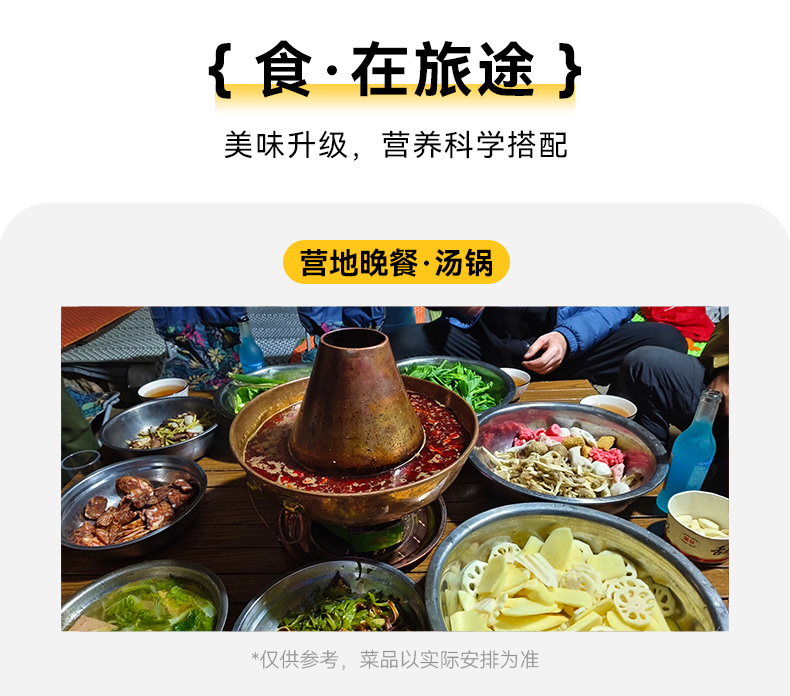 3.餐食:全程所列餐食合计1正2早,营地餐参考汤锅或中餐。