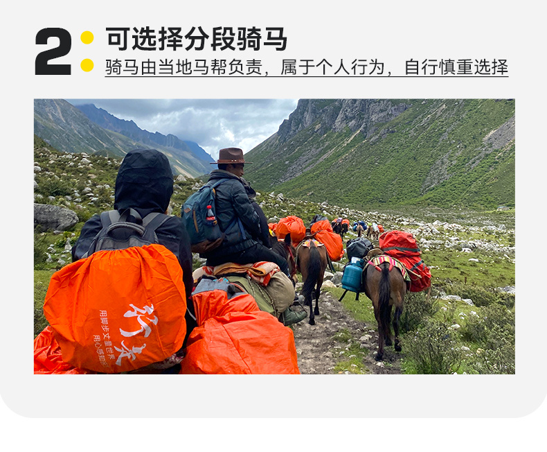 14.公用装备和个人当天活动中用不到的个人物资都通过马匹或牦牛驮运,只需自行做好打包避免丢失,动物驮运不建议在里面放精密电子仪器和贵重物品,预防损坏和遗失,当天只需要背负个人饮用水、干粮、雨具等用得到的物品。