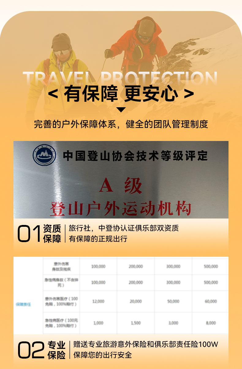 1.赠送专业旅游意外保险和俱乐部责任险100W。