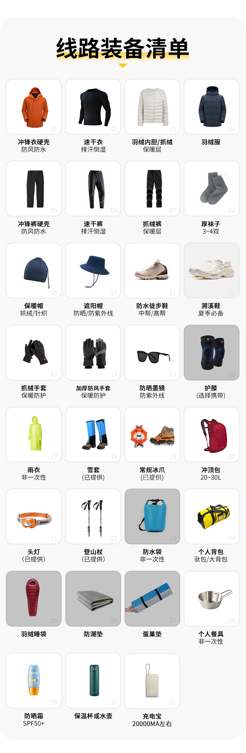12.充电宝(建议20000mA左右,徒步路线较为原始基本上无电源补给)