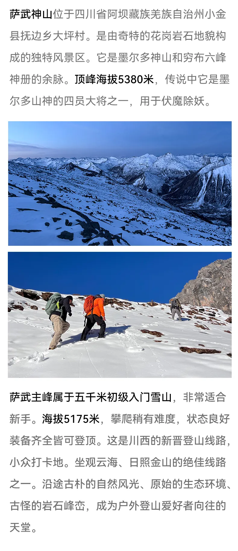 16.关于信号:此次萨武神山攀登活动后1天行程冲顶阶段无信号,无电源补给建议根据路线长度自行配备充电宝,信号最后消失前请提前告知号家人朋友去向,提前安排好在无信号期间的工作生活等,避免家人朋友担心。