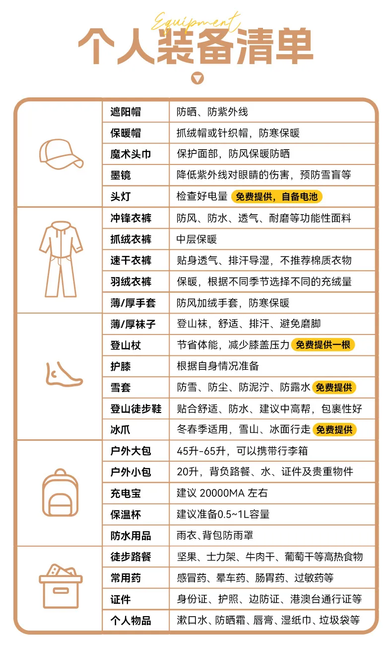 提供装备使用:冰爪+雪套+登山杖+头灯(需自备电池)。