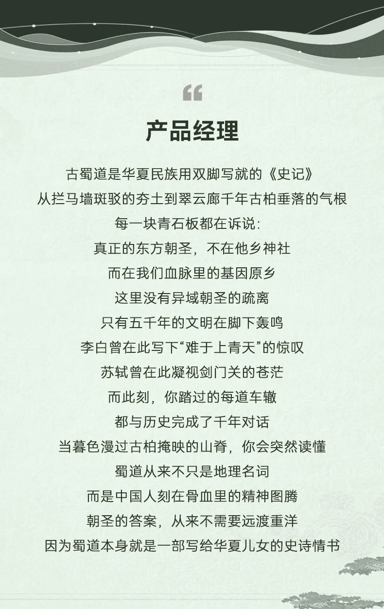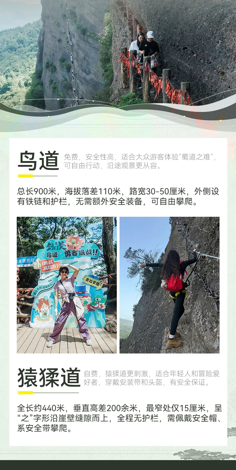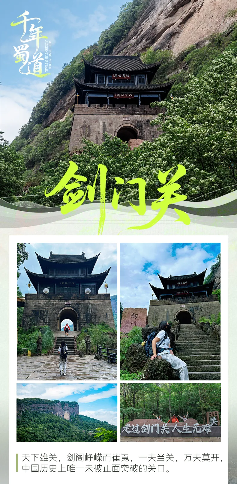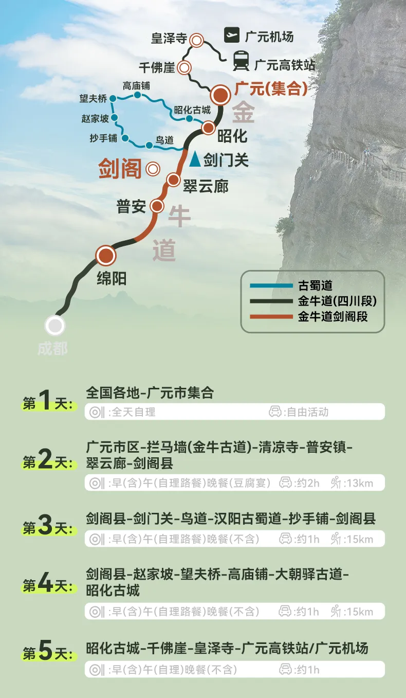 我们早餐时间7点左右,早餐后出发前往“天下第一关”剑门关。登关楼俯瞰金牛道七十二峰,触摸姜维守关「一夫当关」石碑。挑战绝壁鸟道,贴千仞绝壁握铁链前行,在猿猱愁渡处与苍鹰并肩。随后乘车深入汉阳古蜀道核心段。踩过唐宋马蹄印青石板,听松涛裹挟千年驼铃残响。途经抄手铺古驿站,在残存栓马桩旁啜饮老荫茶,解码清代驿丞账簿的神秘符号。徒步结束后乘车前往剑阁县入住,晚霞中回望剑山如戟,完成从金戈铁马到商旅尘烟的立体穿越。