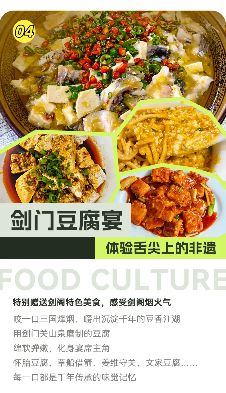 美食:广元蒸凉面,豆花稀饭,川北凉粉,鹤龄水煮包子,剑门豆腐宴。