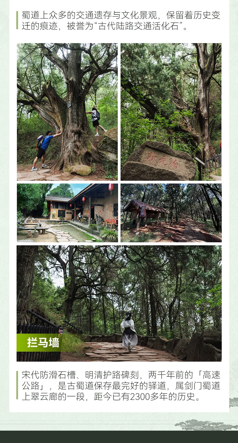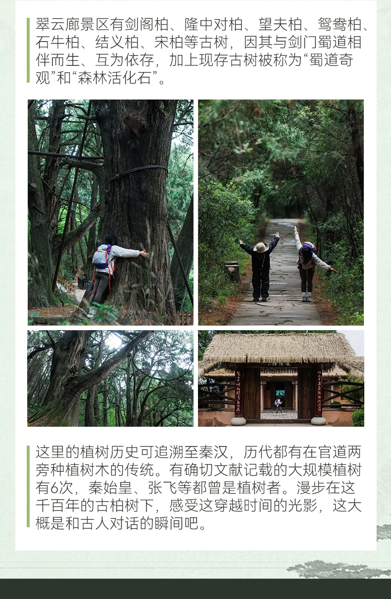 我们早餐时间7点左右,早餐后岀发前往今日徒步起点,开始今日的古蜀道之行。沿108国道南行1小时抵拦马墙。踏过三合土古驿道,辨石壁宋代「贱避贵」交规刻字,看千年古柏虬枝刺破晨雾。随后转至清凉寺,抚摩明代大殿「蜀道梵钟」,在壁画残卷里寻访张飞植柏传说。中午抵普安镇自行就餐,下午开启翠云廊之行,穿行「皇柏」密码阵,触摸秦植松/汉栽柏/明补杉三代古树年轮。游玩结束后返回剑阁县,晚风里回望三百里廊道如苍龙盘山,完成从商旅蹄印到帝国官道的文明溯源。