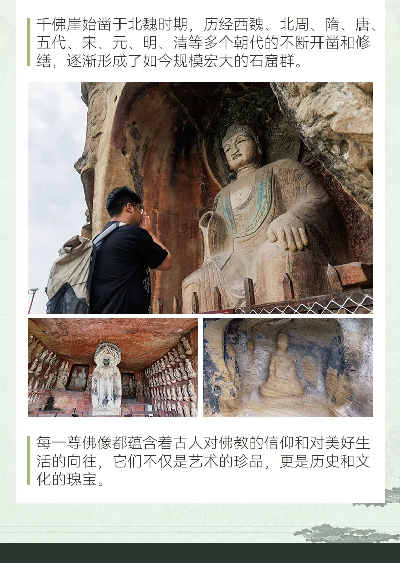 我们早餐时间7点左右,早餐后出发乘车前往千佛崖开启今日行程。驱车20分钟抵达千佛崖,仰望嘉陵江畔的北魏至唐摩崖造像,七百余龛佛像在赭红岩壁上凝固时光(游览1小时)。正午于千佛崖附近自行就餐,短暂休整后前往皇泽寺(车程15分钟),探秘中国唯一女皇武则天的祀庙,触摸唐代中心柱窟与则天殿匾额真迹(游览1小时)。预计下午【15:00】左右抵达广元高铁站,沿途可遥望乌龙山巅的凤凰楼,结束这场从秦汉烽烟到盛唐梵音的穿越之旅。