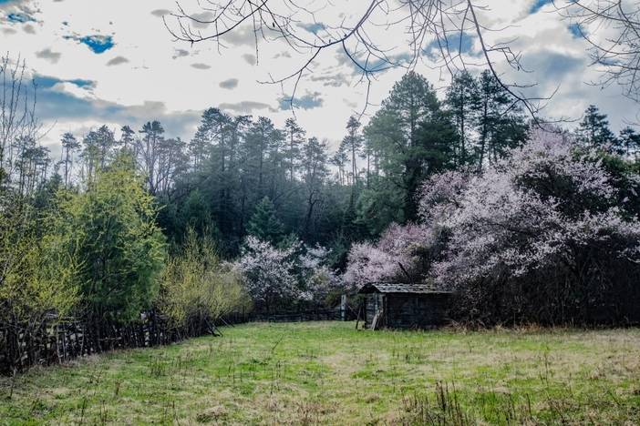 随后前往波密桃花沟,这里的桃树不是人工栽植,都是野生的。几百年来,藏乡人民从没有人破坏和砍伐,这与藏族人喜爱万物生灵有很大的关系。云带挂山腰,雪山影河谷,田地绿色浓,农舍错落间,牛马悠然行,桃花遍地现。这不是文人笔下的仙境,而是人间林芝四月天。