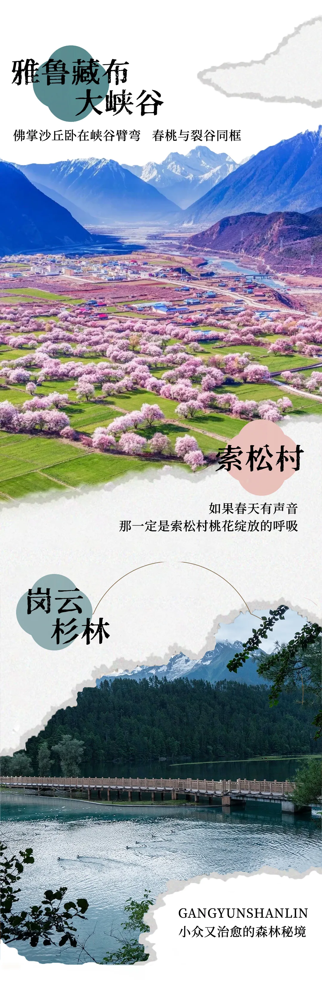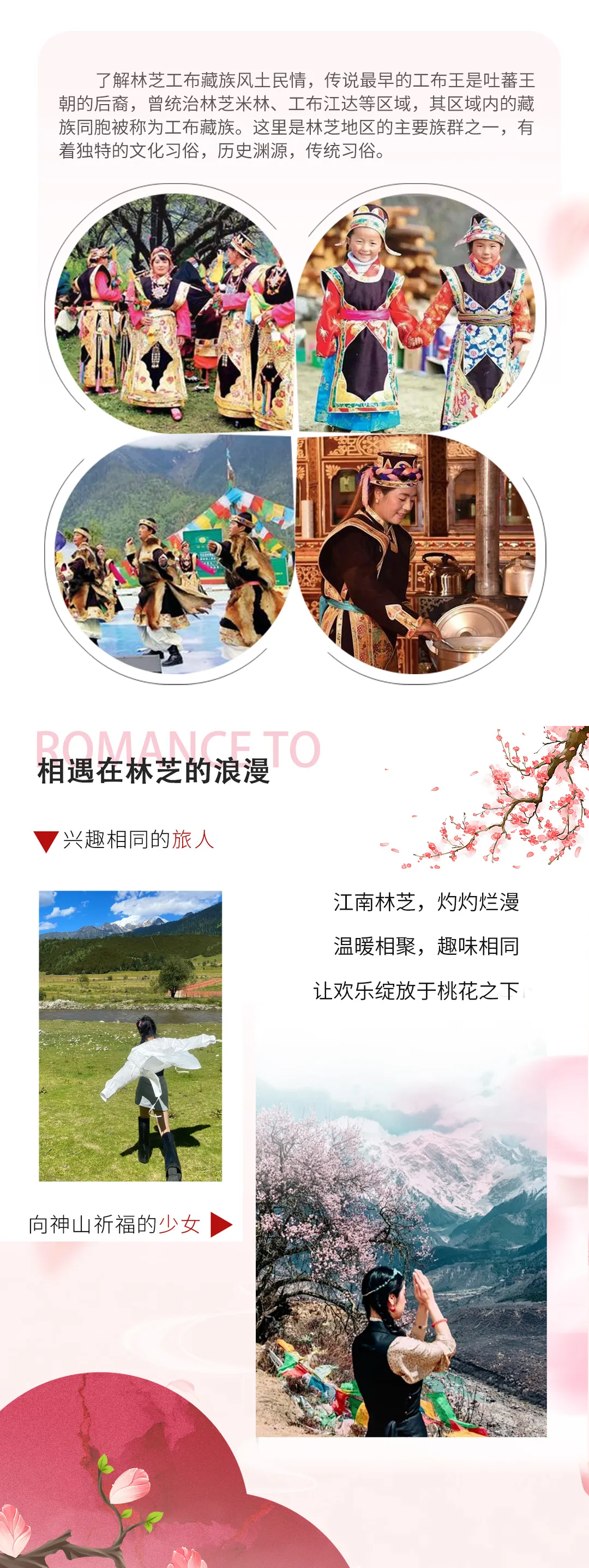 这里生活着珞巴、门巴等少数民族,他们的生活习惯及宗教信仰皆保留着浓厚的传统色彩,具有独特的民族风情。3月的林芝,寒意未尽,却已是花的海洋。粉嫩的桃花,在气势磅薄的雪山怀抱中无限柔媚。妖娆桃花,映着蔚蓝云天,美不胜收。