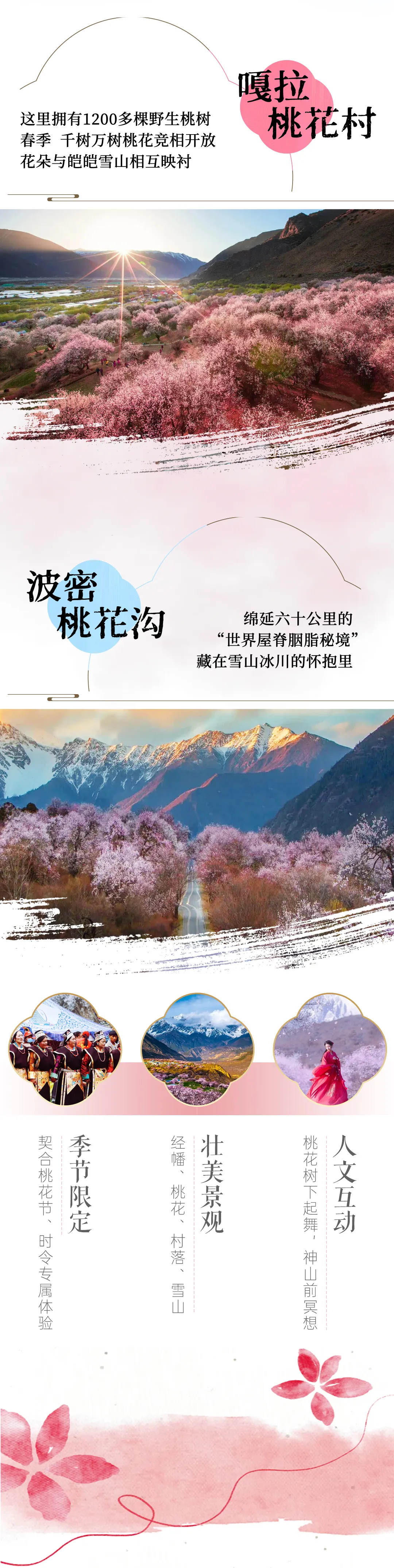 随后前往嘎拉桃花村,这里三月桃花盛开,漫山遍野。桃园依山傍水,极目远眺,眼底尽是尼洋河风光。水中倒映着对面青山,远处雪山分外妖娆。三面环山的嘎拉村,涧边长满了野生桃树,游人漫步在野生桃花树下,感受着高原的春天。无论是远观还是近玩,都让人回味无穷。在雪山的环抱之下,怒放的桃花延绵数里,犹如红色云海。