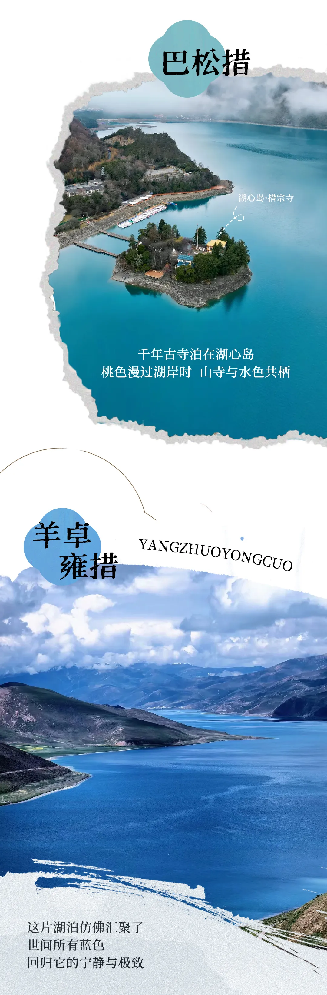 从拉萨出发,随着车缓缓爬升,雪山渐渐拉近,白云游移,仿佛开车在云端一般。我们先翻过岗巴拉山,来到的是羊卓雍措,被誉为世界上最美丽的水。不同时刻阳光的照射,羊湖会显现出不同层次、极其丰富的蓝色,羊卓雍措的水源来自四周念青唐古拉山脉的雪水,没有出水口,雪水的流入与自然的蒸发达到一种奇特的动态平衡,湖水随着光线变幻,演化成千变万化的蓝色。