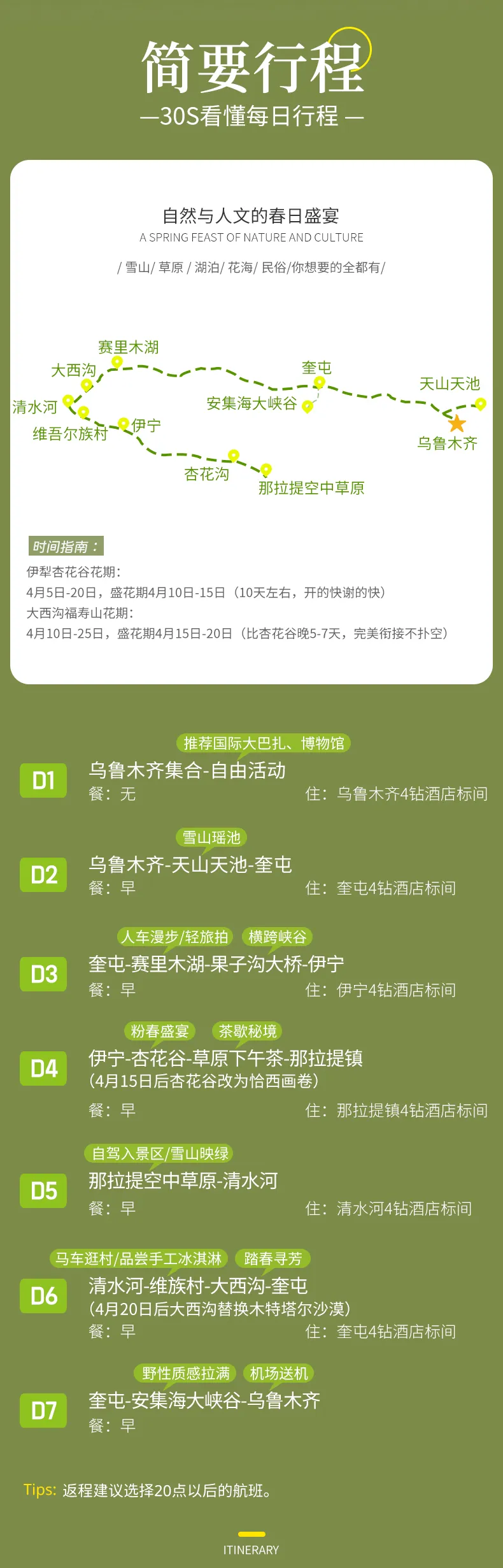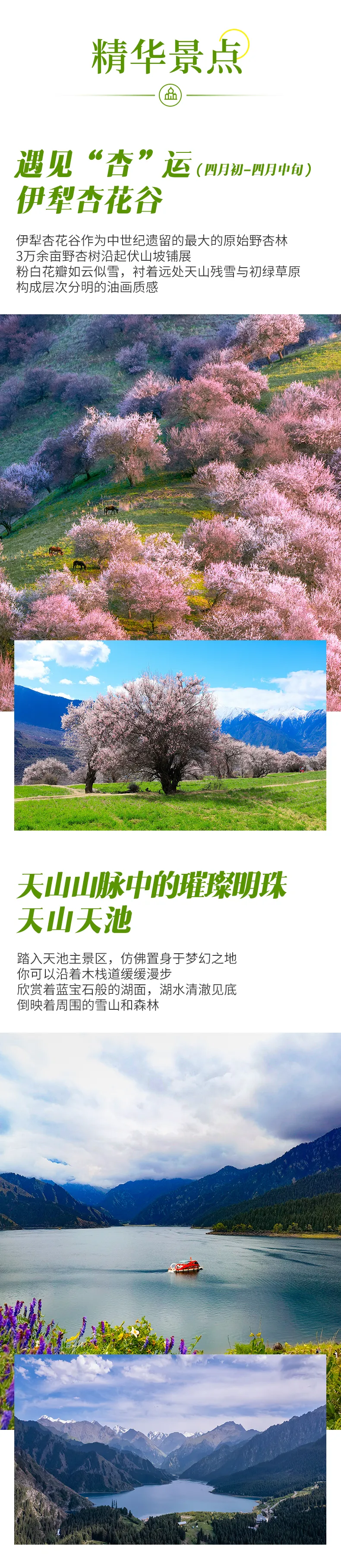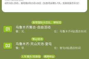 4、门票:天山天池门票+区间车,赛里木湖自驾票,杏花谷门票(花期过后改为恰西门票),大西沟福寿山门票(花期过后改为木特塔尔沙漠景区门票),那拉提自驾票;