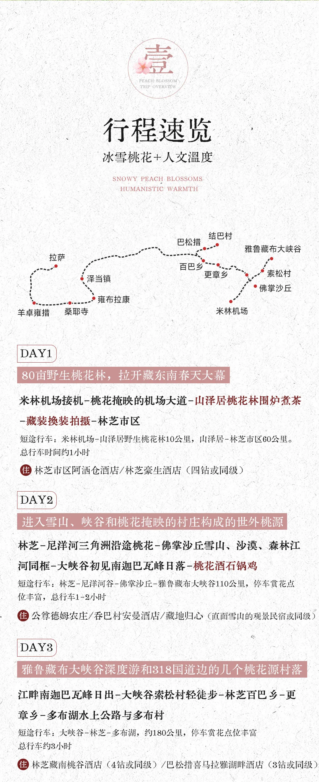 短途舒适行车:米林机场-山泽居野生桃花林10公里,山泽居-林芝市区60公里。总行车时间约1小时。