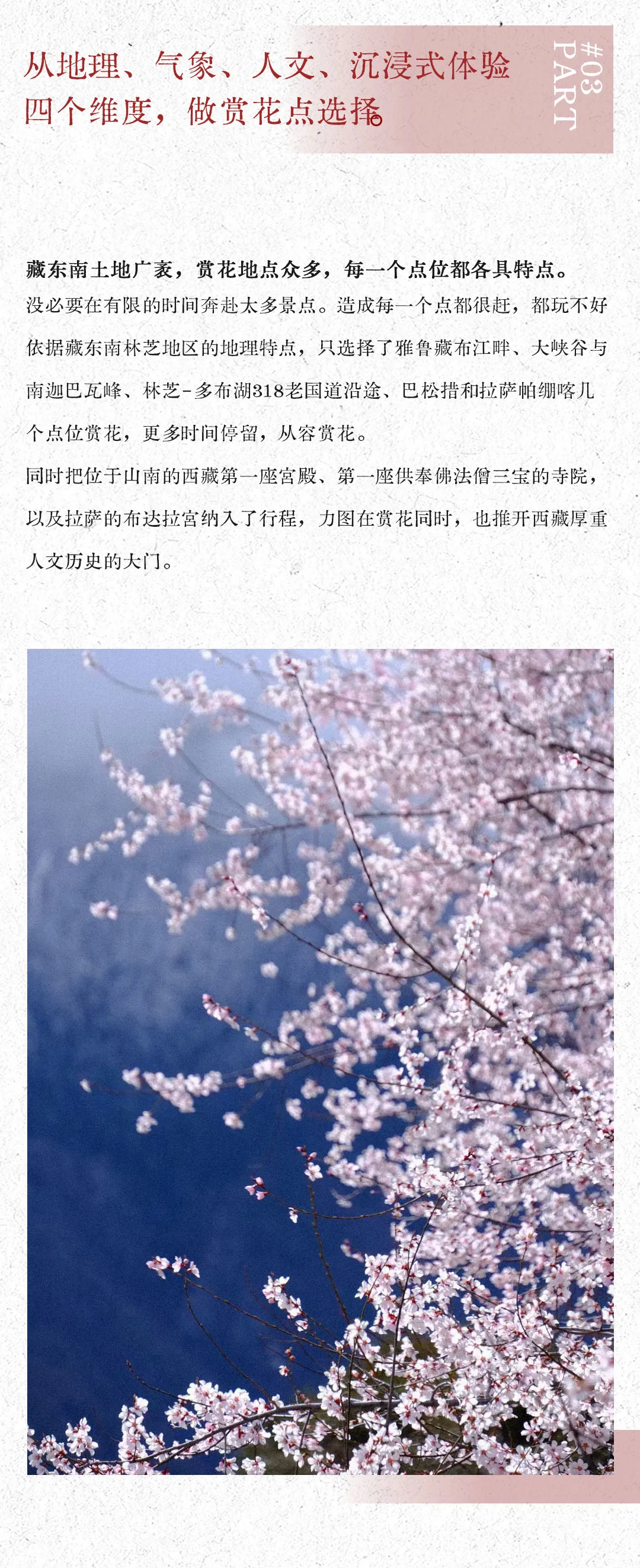 Tips:巴松措区域内,虽然因海拔原因花期会稍晚于大峡谷和林芝地区,但花期时间更长,会延续到4月中旬以后。