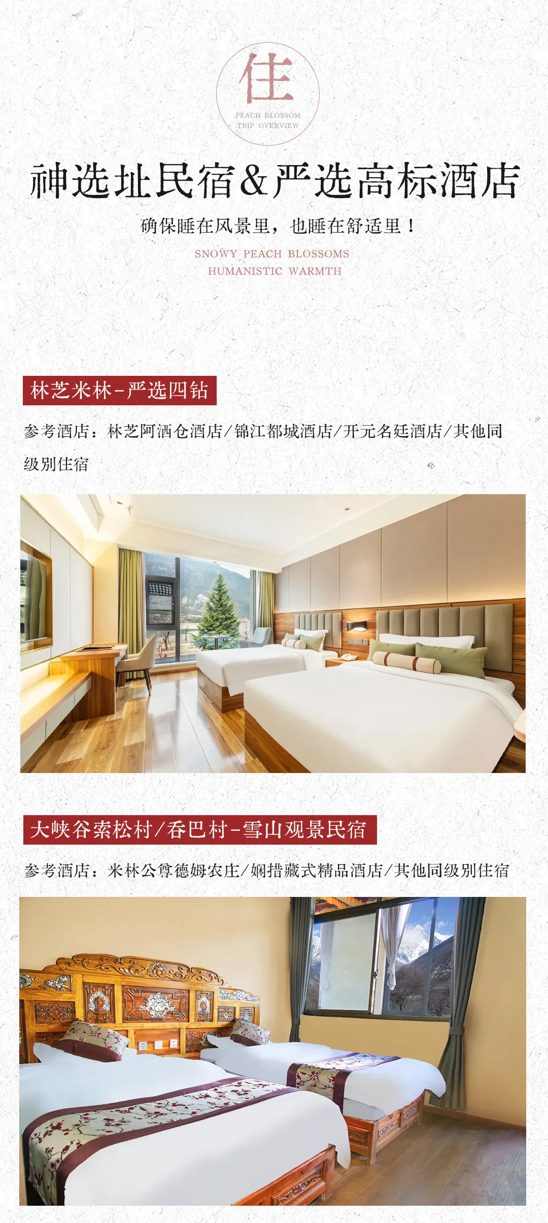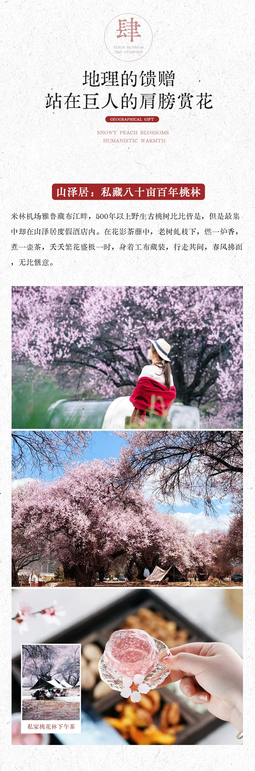 2、入住酒店为林芝市区,桃花林下午茶安排于山泽居酒店桃花林进行,也可选择野生桃花林自己搭建天幕进行。