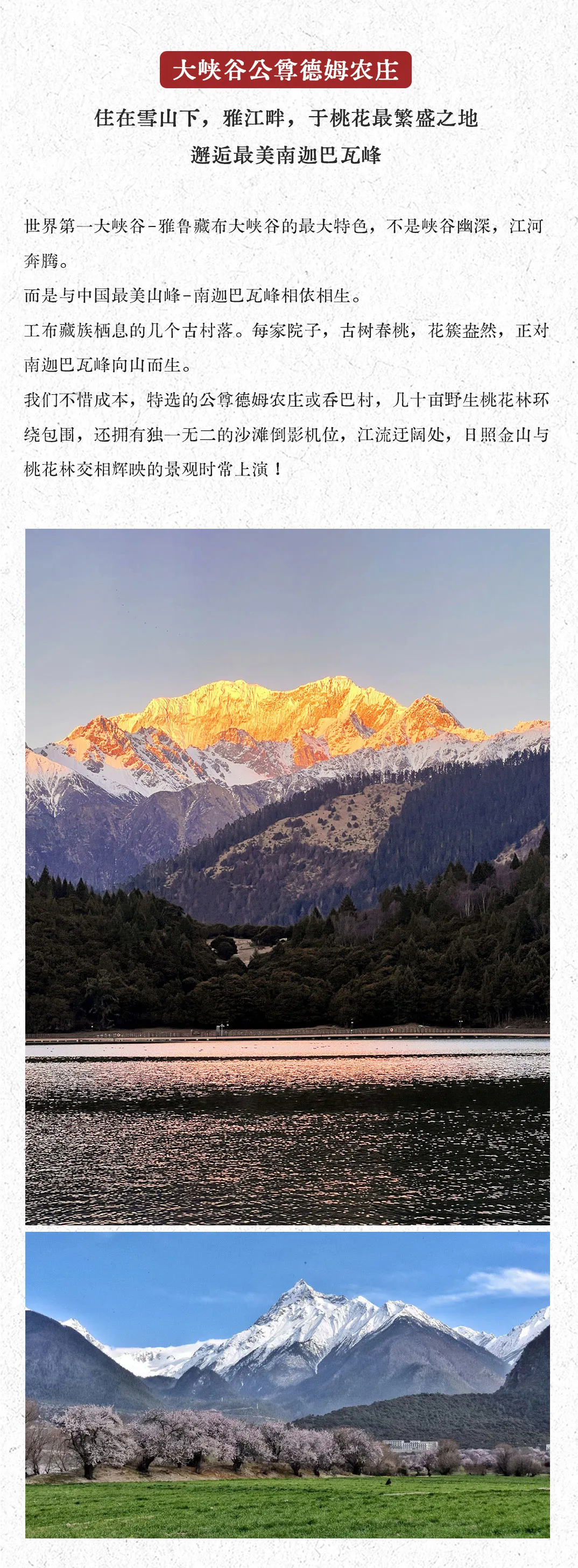 今天沿江河驶入藏东南的春天。尼洋河在雪山隐隐之下,碧水流深,夹岸桃花绵延成片。3月中旬至4月中旬是青稞的播种期,农庄青稞油绿,柳丝鹅黄,一年中最鲜嫩的色彩,都集中在这几天绽放了。佛掌沙丘则是雅江中游的一个奇迹,在周围都是碧绿农庄森林的环境下,竟然被每日里河滩上扬起的河沙堆积成为一个巨大的沙丘,由此形成雪山沙漠与大江同框的反差之美,无比神奇!到达派镇,换乘景区观光车直达索松村,雅鲁藏布大峡谷两岸的村庄,被神山庇佑,是瞻仰神山、俯瞰峡谷的绝佳位置,峡谷中繁盛的桃花与青稞田、雪山交相辉映,很适合一边走一边寻找角度拍摄大片。当夕阳西下,回到雅鲁藏布江畔的沙滩上,360°欣赏神山南迦巴瓦峰、多雄拉雪山,看落日余晖把南迦巴瓦峰染成熔岩金色,脚下的江水倒影,天地交辉,震撼无比。