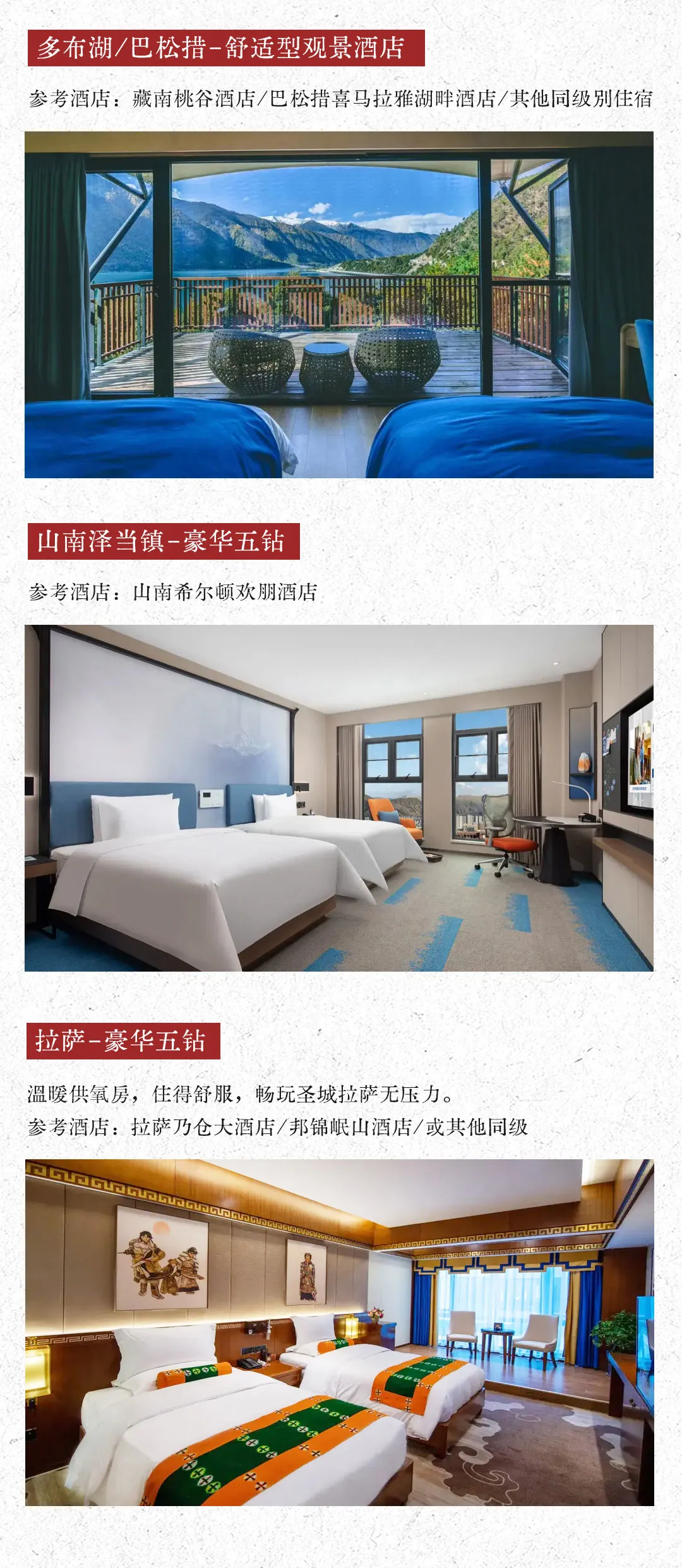 住宿:拉萨河畔乃仓大酒店/岷山邦锦花园酒店/雪域天堂大酒店(五钻或同级)