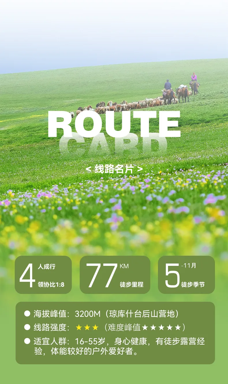 行程概览:在阳光的照射下缓缓拉开帐篷,感受着早间的柔和暖意,微风里夹杂着淡淡花香与鲜草的味道,慢慢收拾起床早餐后拔营出发,今天相比前两天会相对较难,将翻越本次行程最高的点位克孜勒斯达板2920m,站在草原的最高点俯视着莽莽大地感叹着世间的美妙,此刻心中的所有躁意也终将释怀,在这里吃过路餐下午就会迎来一个长的缓下坡,最后抵达我们的塔里木景区。