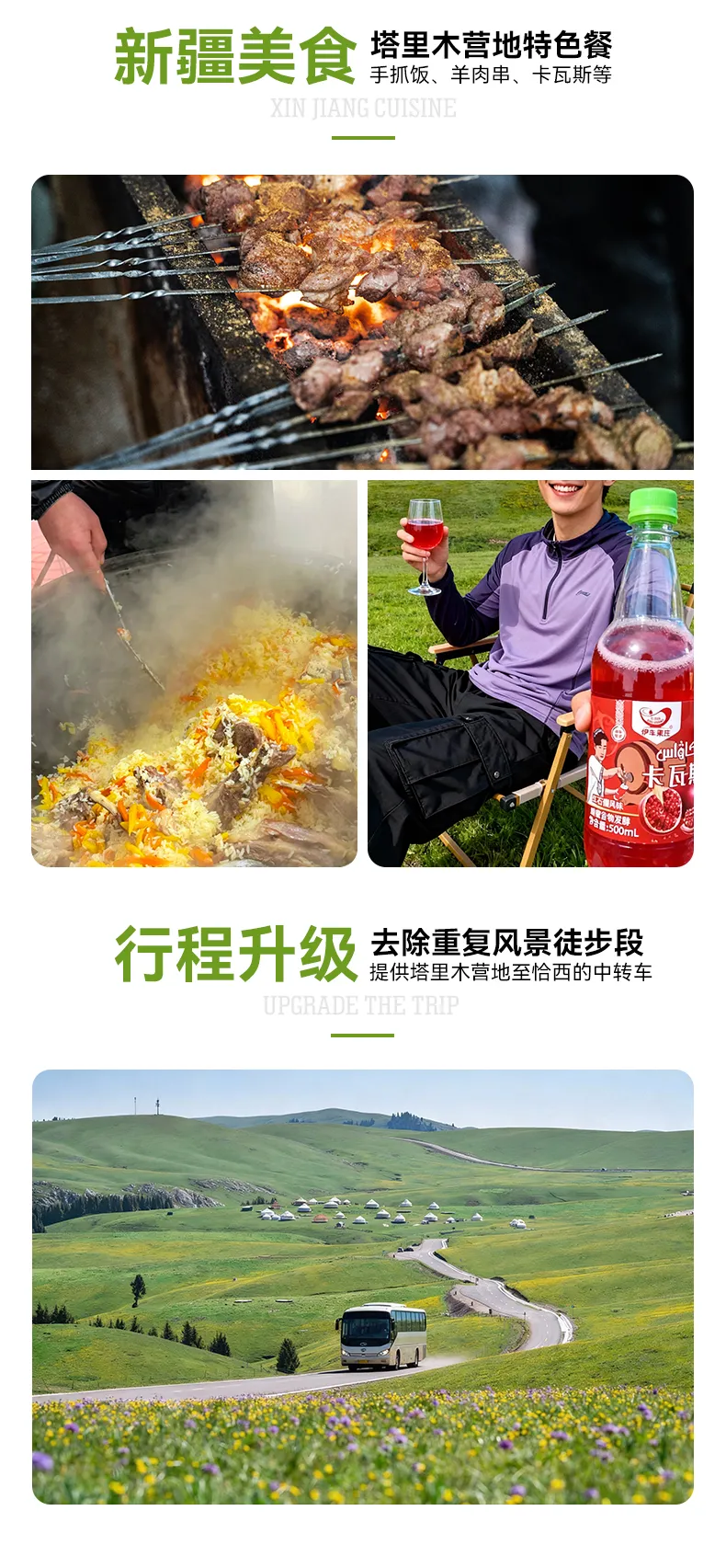 行程概览:早餐后大约9点拔营出发,今天的徒步距离也不断但是路况相对舒适都是一些缓上缓下,行走在塔里木景区腹地,路边的居民散落其间给人世外桃源的感觉,慢慢的穿梭在恰西的林间野花,今日后半段机耕道免费安排中转车到今日营地,途中经过恰西画卷可停留拍照,这里还流行这样一句话“塞外江南是伊犁,伊犁最秀在恰西”每年的春夏交替时节也是恰西最具魅力幽静之时,满足你对新疆的极致探索。最后统一乘坐车辆开启返回伊宁(参考到达时间为19:00-21:00)。