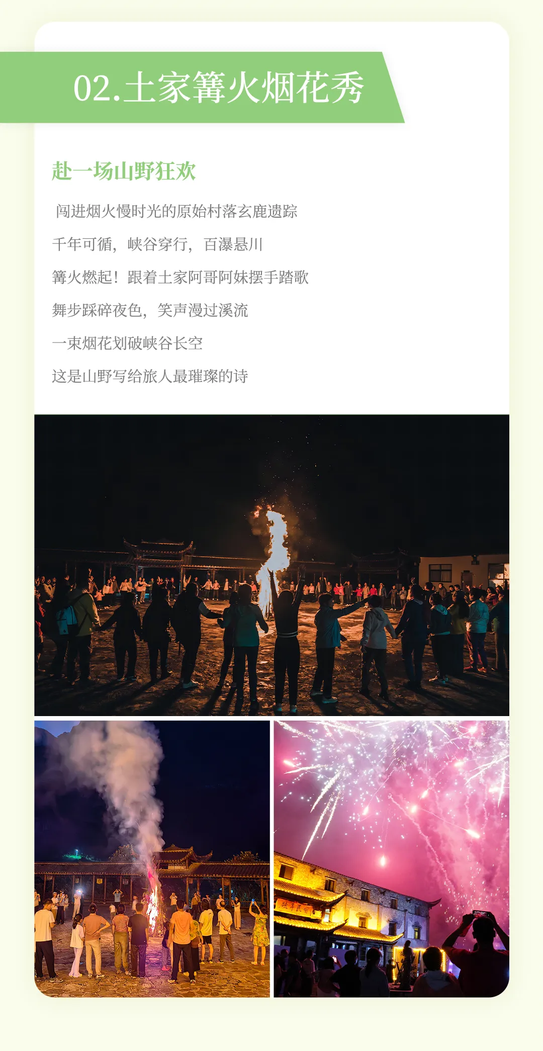 晚间活动:鹿院坪入住需满 15 人举办篝火晚会,不足则换烟花歌会;若住沐扶古镇,无篝火 / 烟花歌会,晚餐正常包含。