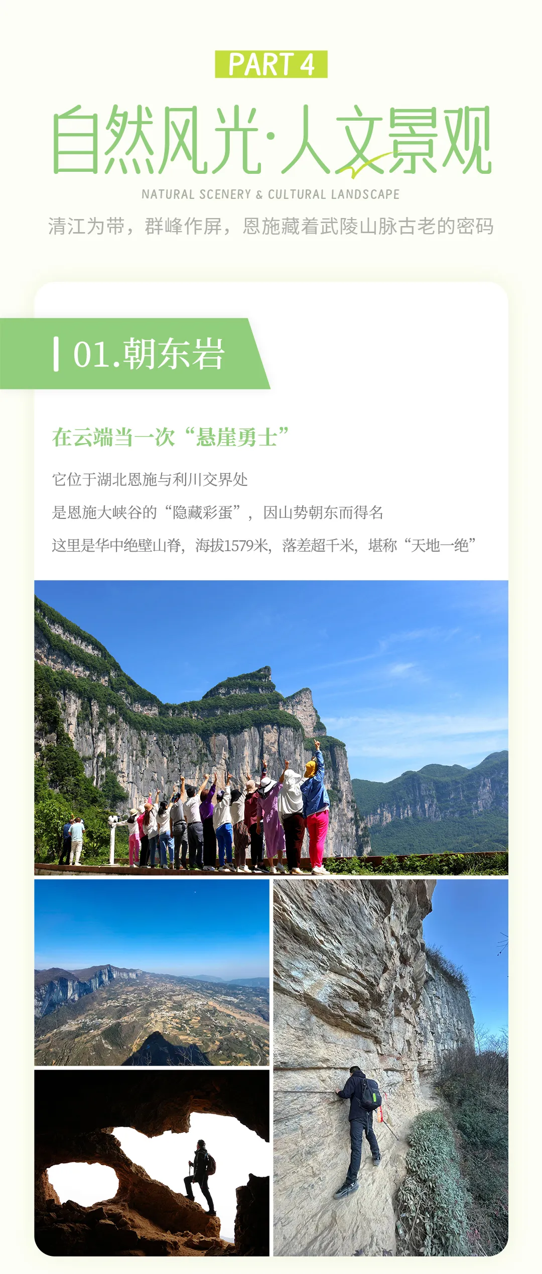 - 它位于湖北恩施与利川交界处,是恩施大峡谷的“隐藏彩蛋”,因山势朝东而得名。这里是华中绝壁山脊,海拔1579米,落差超千米,堪称“天地一绝”。属于典型的喀斯特地貌,有蘑菇洞、硝矿坑等洞穴,洞内有钟乳石等景观。