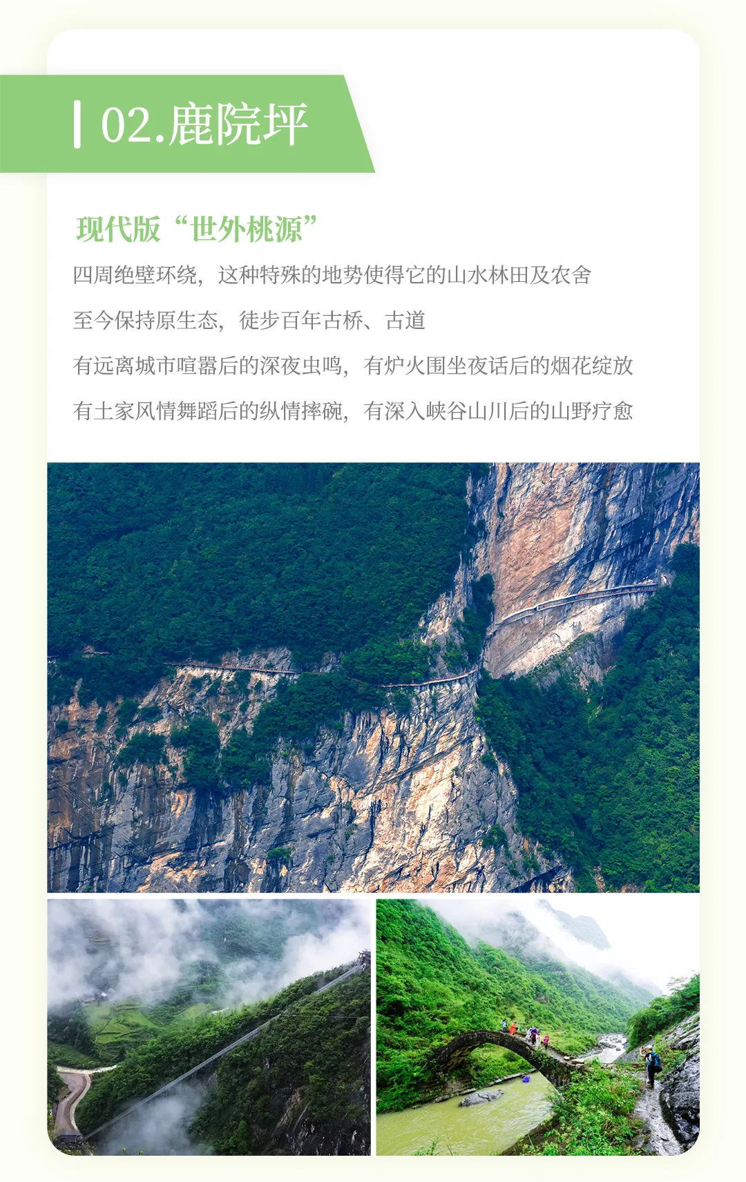 - 走在鹿院坪的土家村落栈道上,看着木柴炊烟袅袅升起,吊脚楼依山傍水错落有致。行至峡谷谷底,澄澈溪流潺潺流淌,大家或俯身轻触清凉溪水,或举相机定格这份山野灵动。