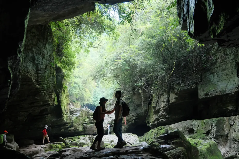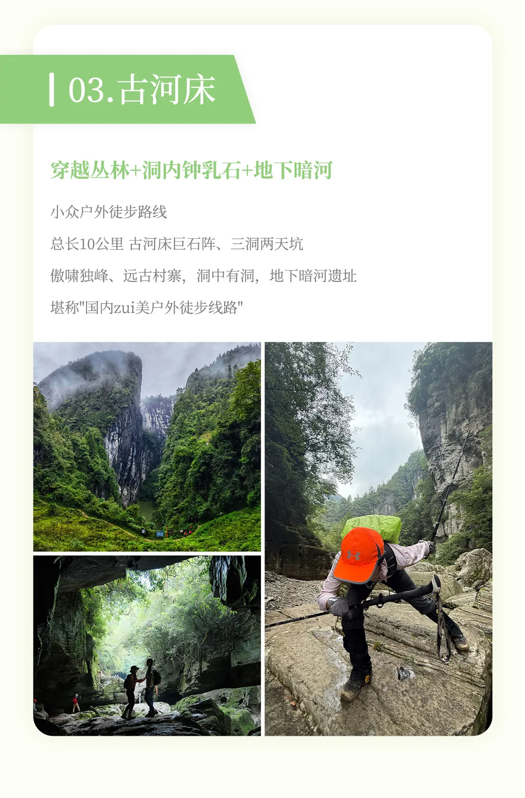 - 这里拥有巨大的出水洞,和干涸的河床。上布满了千奇百怪、形态各异的巨石,它们被水流冲刷得光滑圆润。行走其间,需要手脚并用,攀爬跳跃,充满了探险的乐趣。三个天然溶洞组成了三道大门。洞内光线幽暗,需头灯照明。一洞狭窄,仅容一人通过;二洞更为宽敞,洞顶有石板,阳光透下形成斑驳光影;三洞是最特别的一个,洞口与外界相通,形成天然的 “穿洞” 景观,被称为 “天然取景框”。