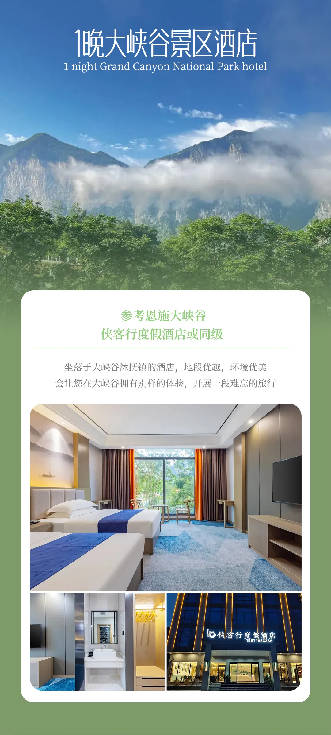 答:1晚恩施市区4钻酒店 、1晚沐抚古镇精品酒店、1晚景区观景民宿;