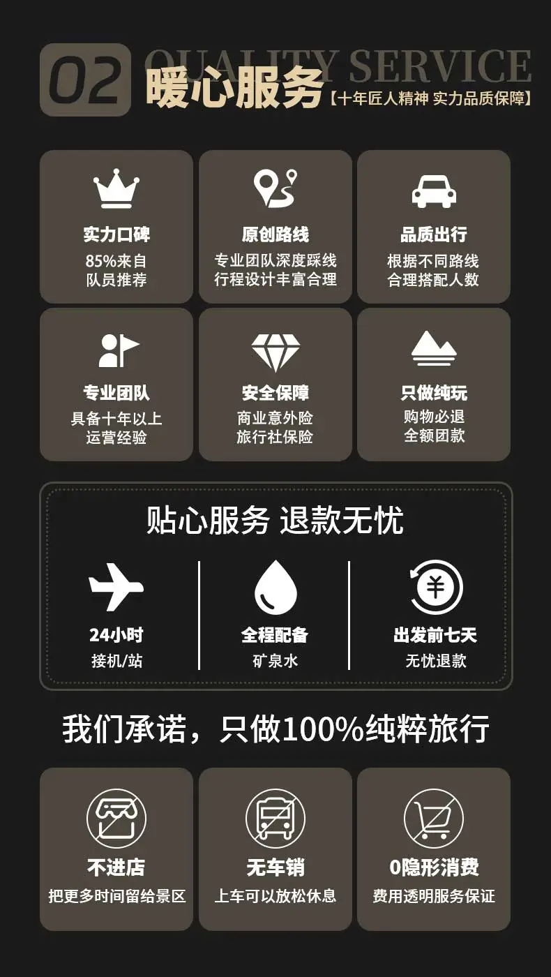 私家团可不限人数成团,指定任意时间成团,服务标准与以上排期产品等同,如需摄影航拍、人文精讲、在地体验等升级服务,可联系客服提供专属定制旅行服务