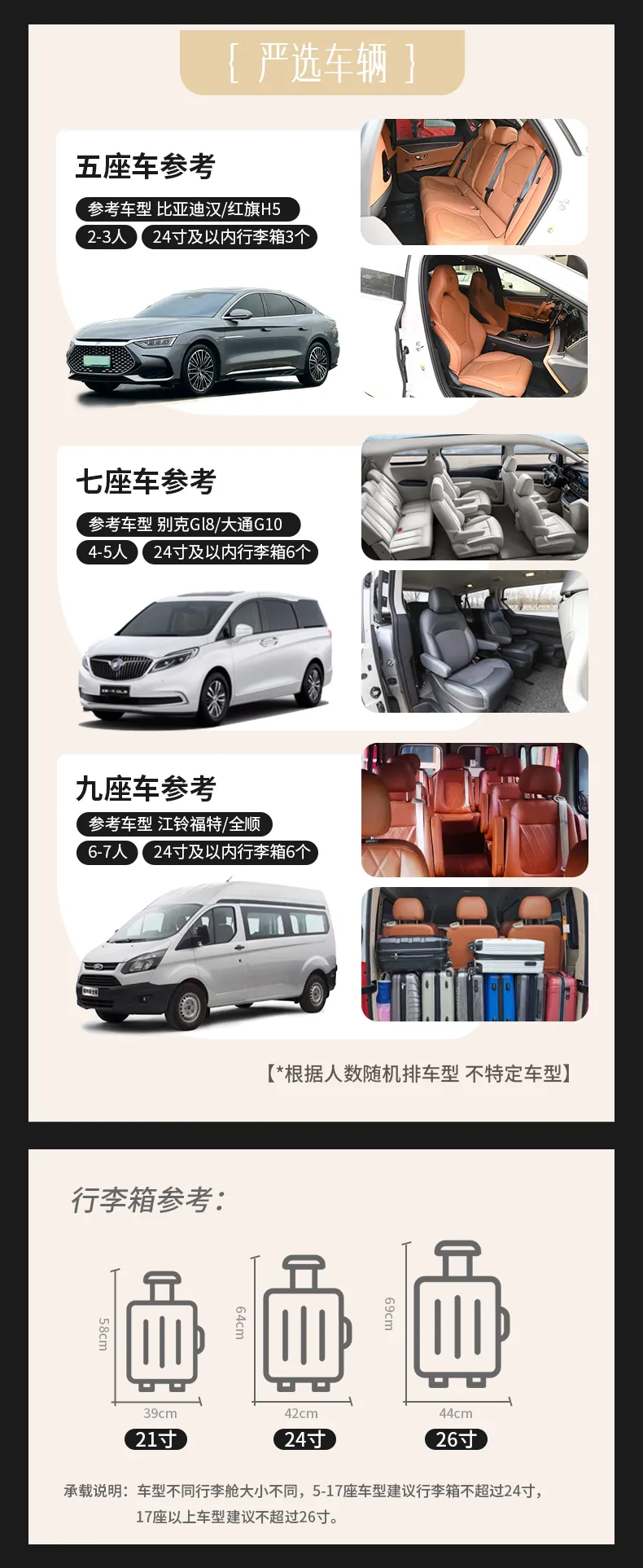 注:接机/站请提前2天告知航班号/车次,否则视为放弃此服务;赠送项目如客人自愿放弃或因特殊原因及不可抗力等原因无法参加,均不退费用,也不等价交换。