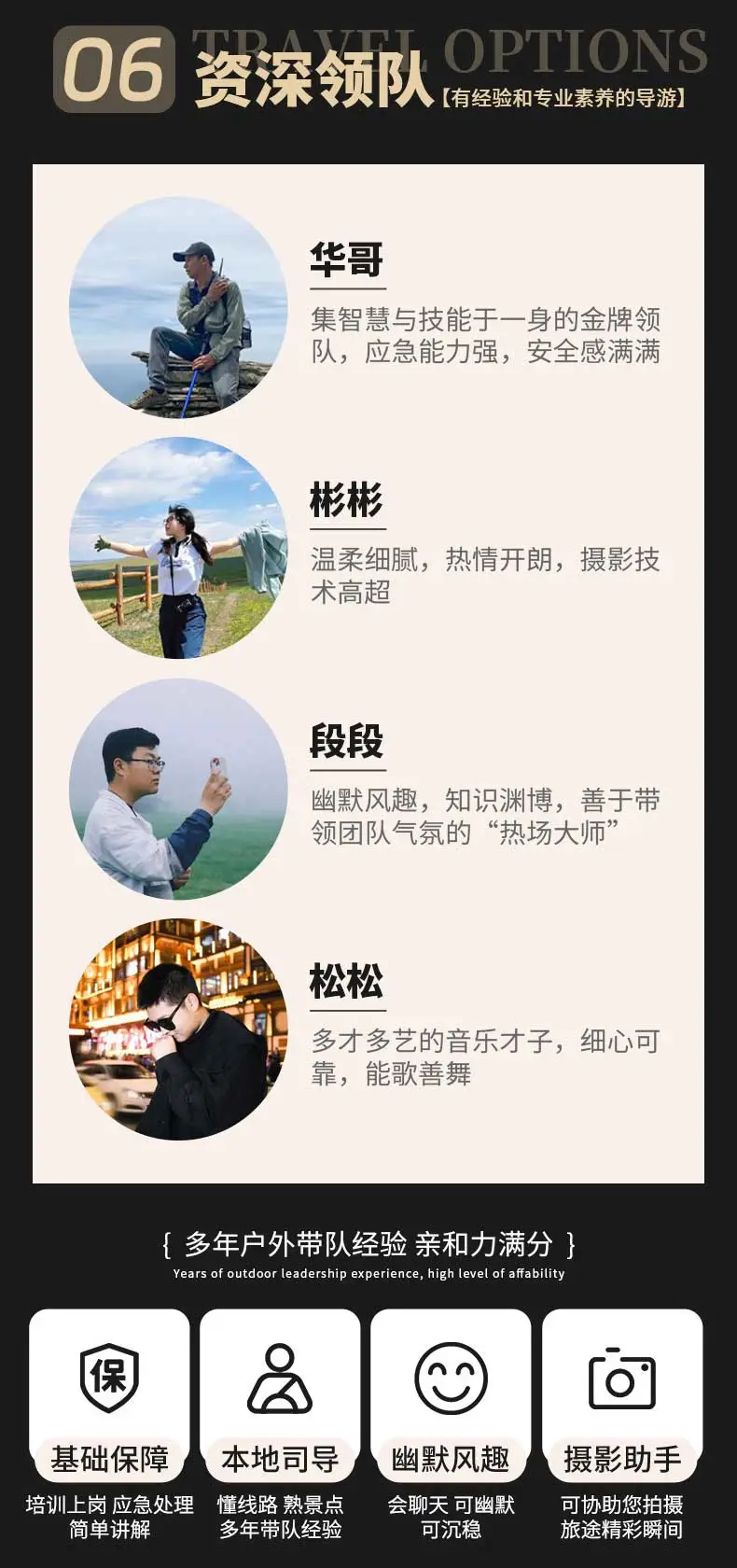 (3)此线路适合5-65周岁旅游者(身体健康,腿脚便利,非大中型手术的恢复期病患者,无传染性疾病、无精神疾病或无严重贫血、无突发性疾病等的户外自然爱好者)报名参加,孕妇不接待;代他人报名者也请核实代报人的身体状况。如果报名者或者代他人报名者隐瞒身体状况,造成的后果,由自己承担;