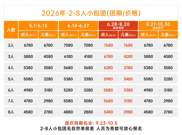 以上团期:成人5480元/人,儿童2980元/人, 房差:1500元