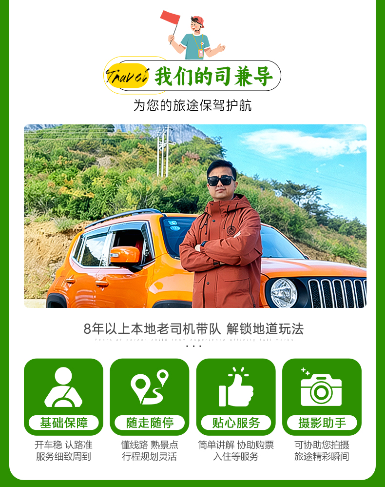 5、领队:司机兼领队(司机仅提供向导、代办住宿等服务;无法像专业领队一样提供讲解、景区伴游等服务!)