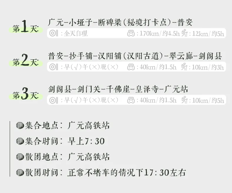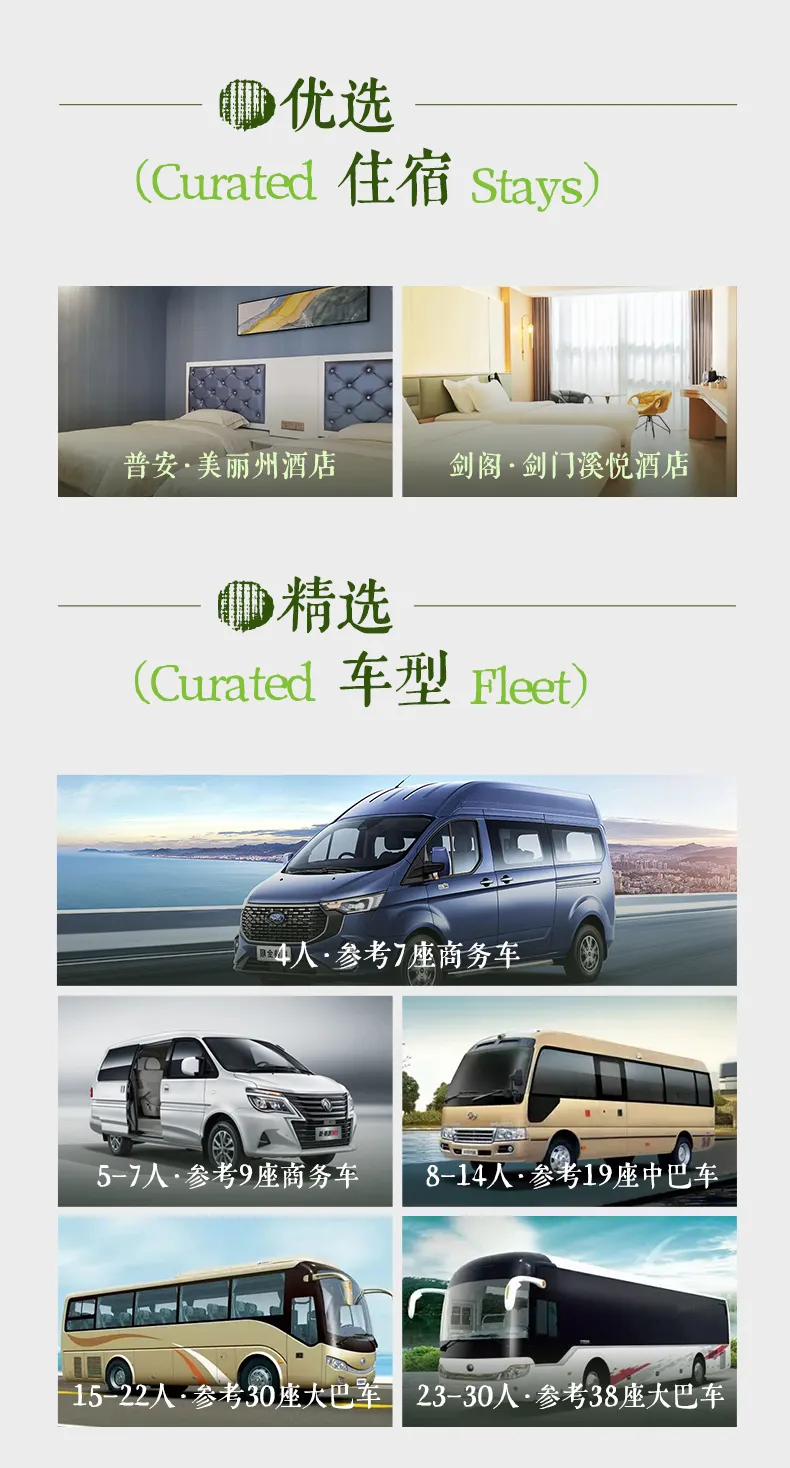 住宿:按行程所列标准入住(详情请参见行程安排,单独参加我们活动,默认与其他同性拼房):普安1晚,剑阁1晚。