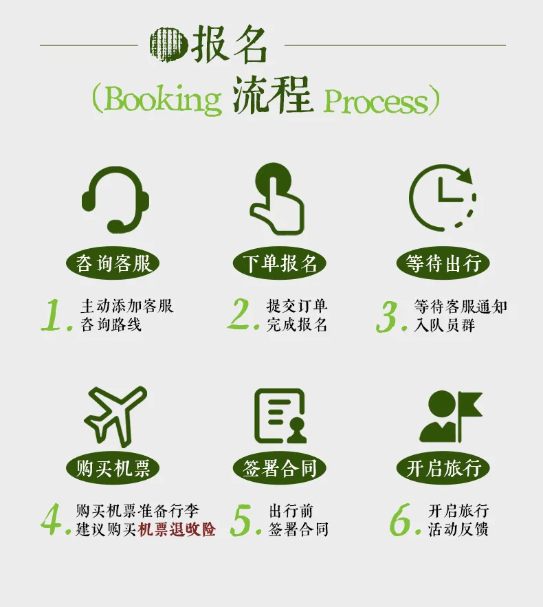 【出团通知】:集合日前3日18:00之前,工作人员发送出团短信通知到您预留的手机上(包括集合酒店名称、地址、电话,微信群二维码以及注意事项等);集合日当日工作人员会再次发消息通知。