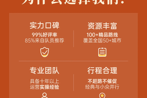 5、 根据旅游法相关规定,不接受未成年人单独报名参加活动;未满18周岁需由监护人带领,并全程由监护人负责照顾。