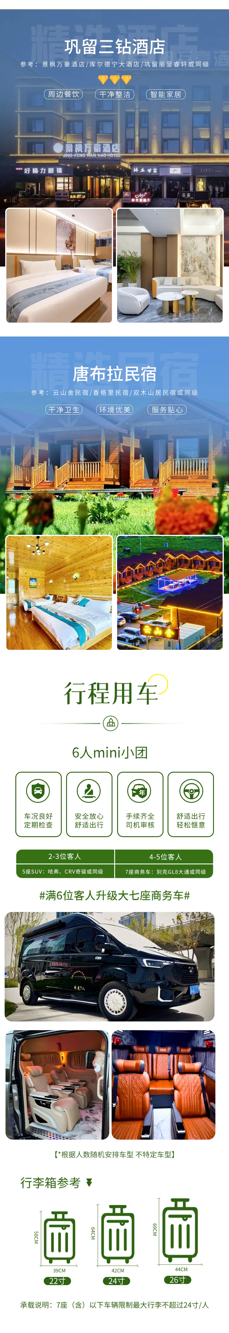 3、用车:2-3位客人用五座SUV,4-5位客人用七座商务车,6位客人升级大七座商务车(小团副驾驶及前后座位置需要轮流乘坐,望悉知);