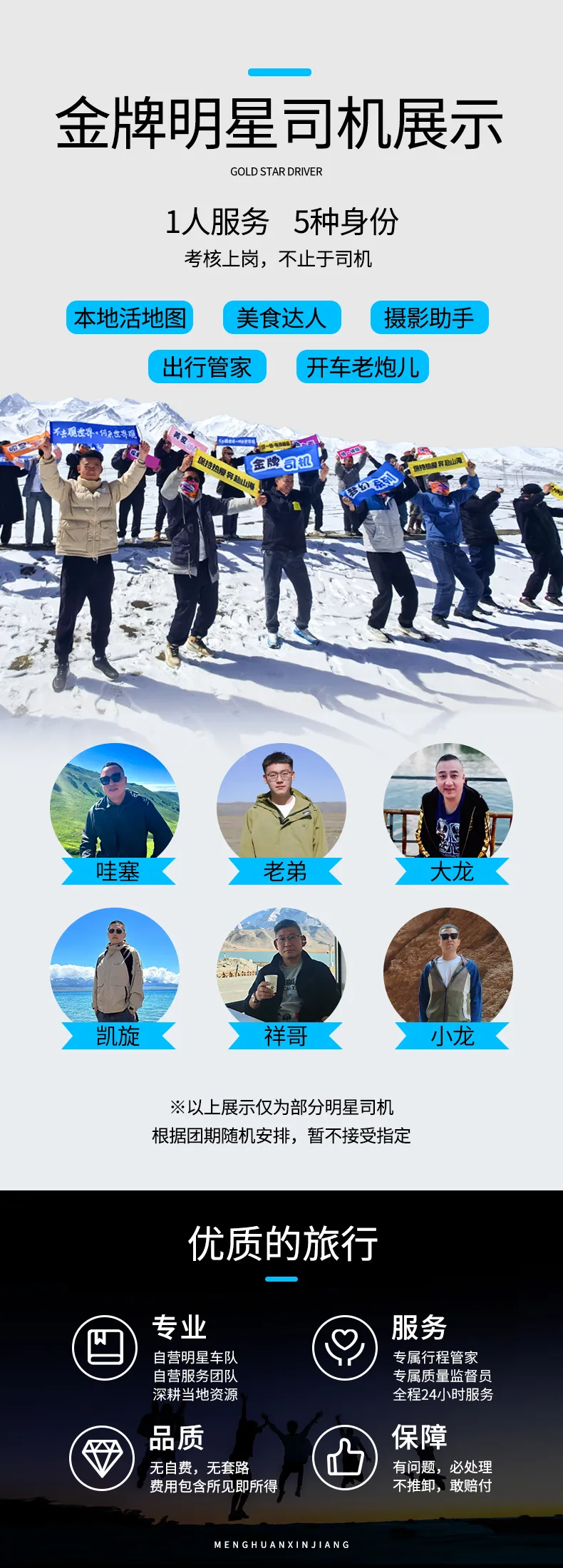5、领队:司机兼管家,司机帮助大家购买门票,给团友游玩建议,无法全程陪同进入景区和提供专业讲解等服务,敬请谅解;